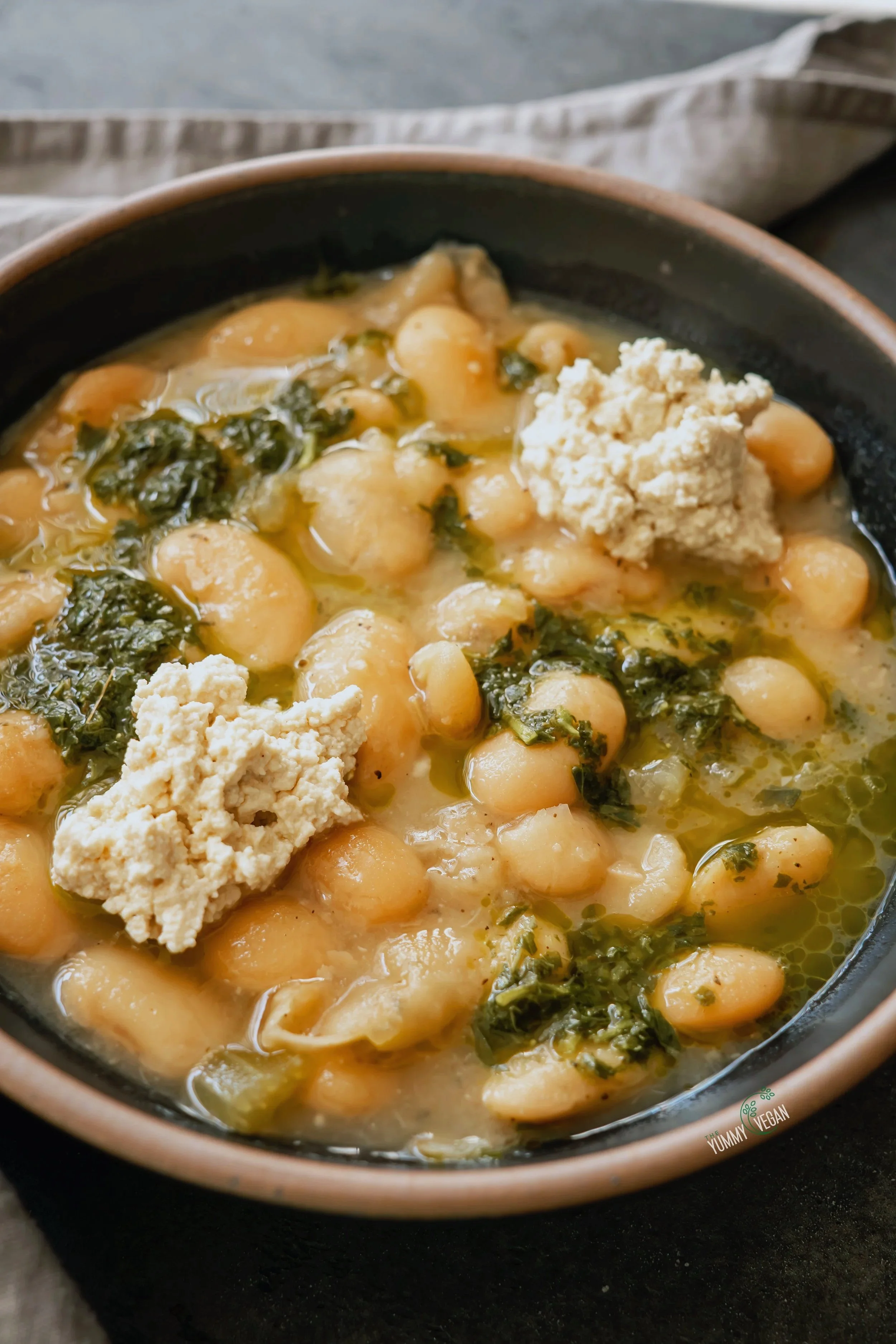 There is something incredibly comforting about a warm bowl of brothy beans. It’s simple, delicious and very satisfying. The flavors are earthy and made with just a few ingredients. This recipe uses dry beans which are a lot easier to cook with but you could also sub canned beans if that’s what you have. The beans and broth are very tasty as is specially served with some crusty bread for dunking but the addition of the creamy tofu ricotta and herbaceous basil oil really level up the entire experience.