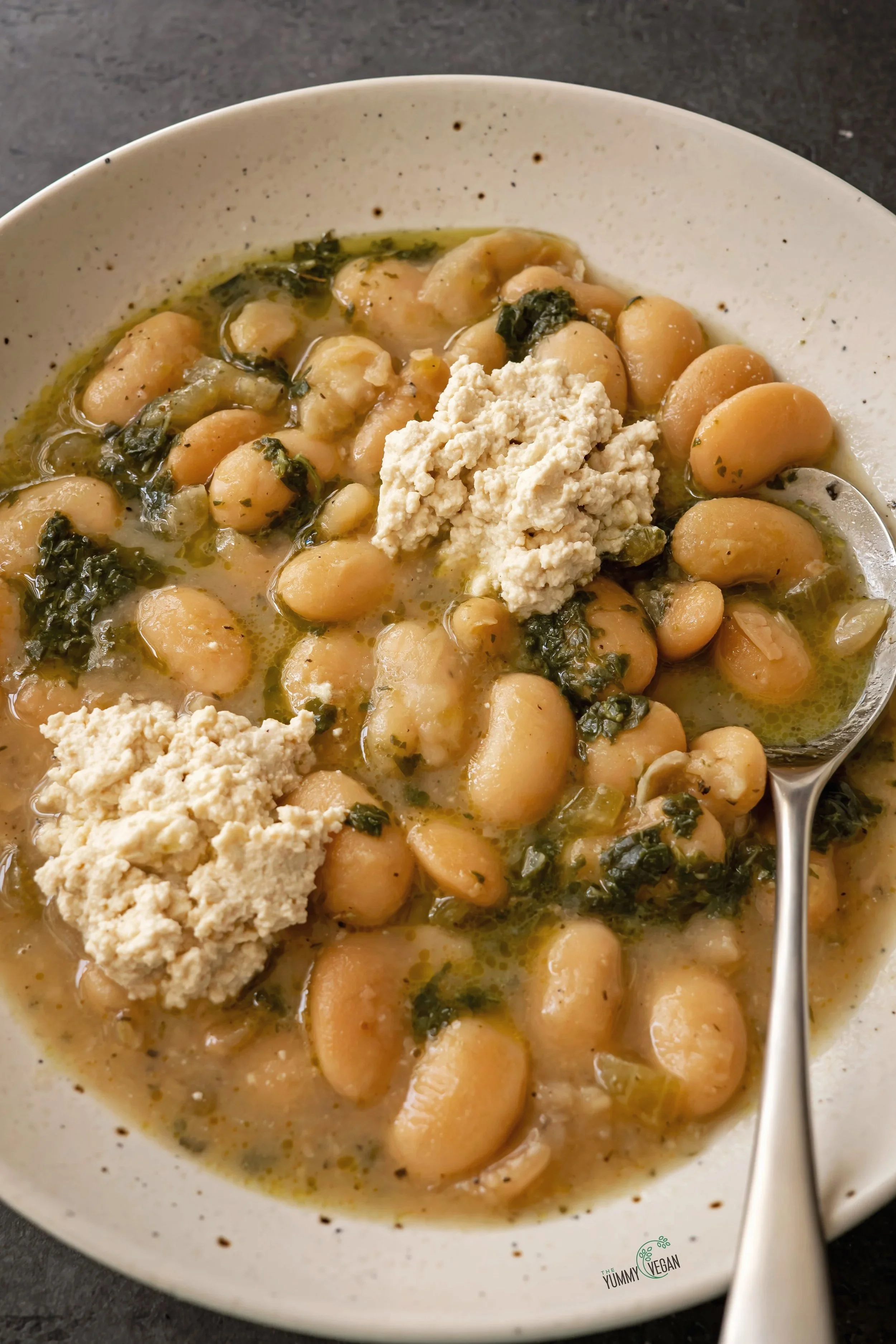 5.Serve up a bowl of the beans and broth with a scoop or two of the tofu ricotta and a generous drizzle of the basil oil. Serve with plenty of grilled / toasted bread for dunking.