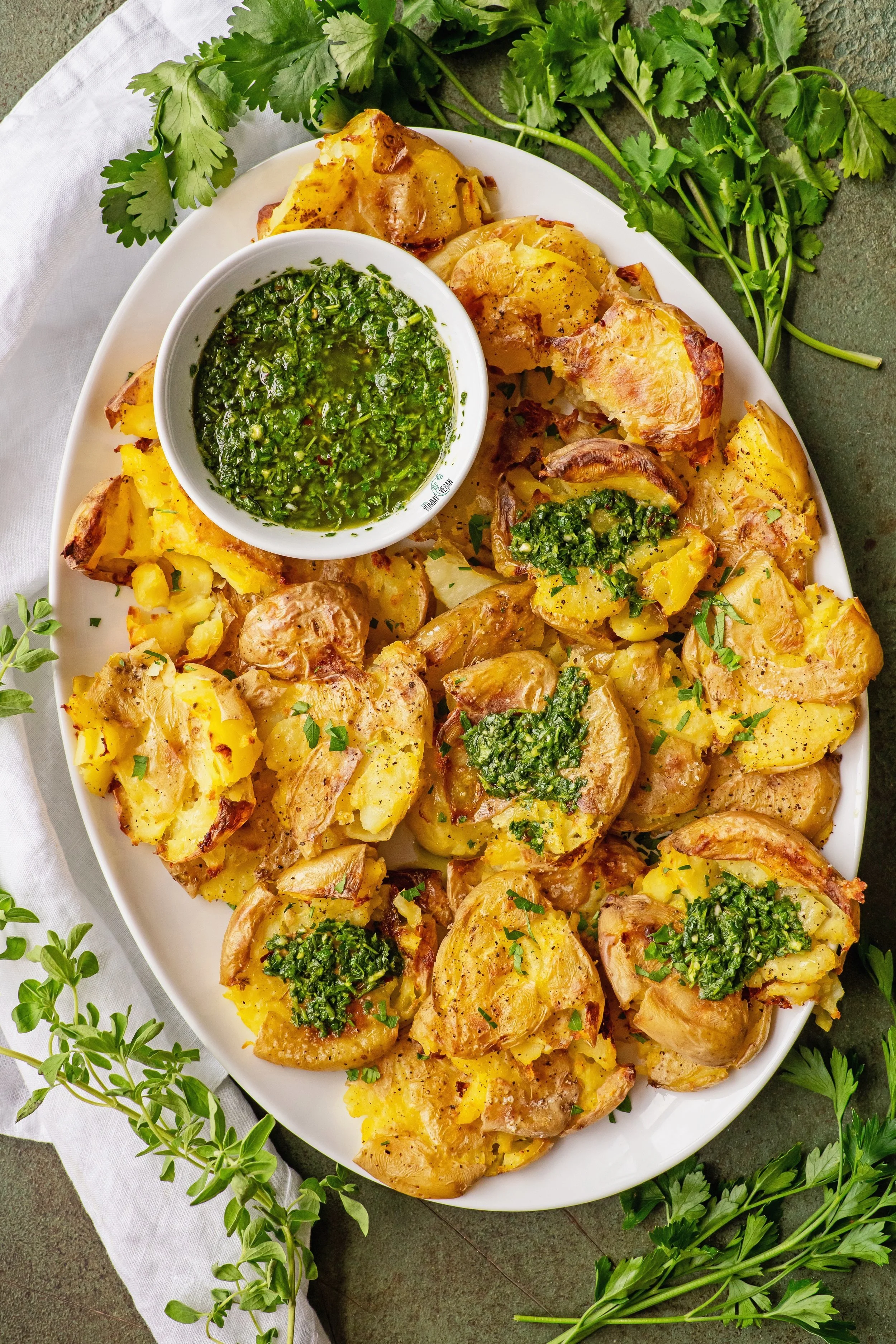 These smashed potatoes are the best of both worlds. They are super crispy on the outside while still pillowy soft on the inside. Of course, if you like your potatoes extra extra crispy then you just have to smash them a little thinner! The best condiment for these is the herbaceous, tangy chimichurri. It’s made easily with fresh herbs and a few simple ingredients quickly pulsed ina food processor or chopped by hand. Enjoy the potatoes dipped, dunked or drizzled all over with the chimichurri, so good!