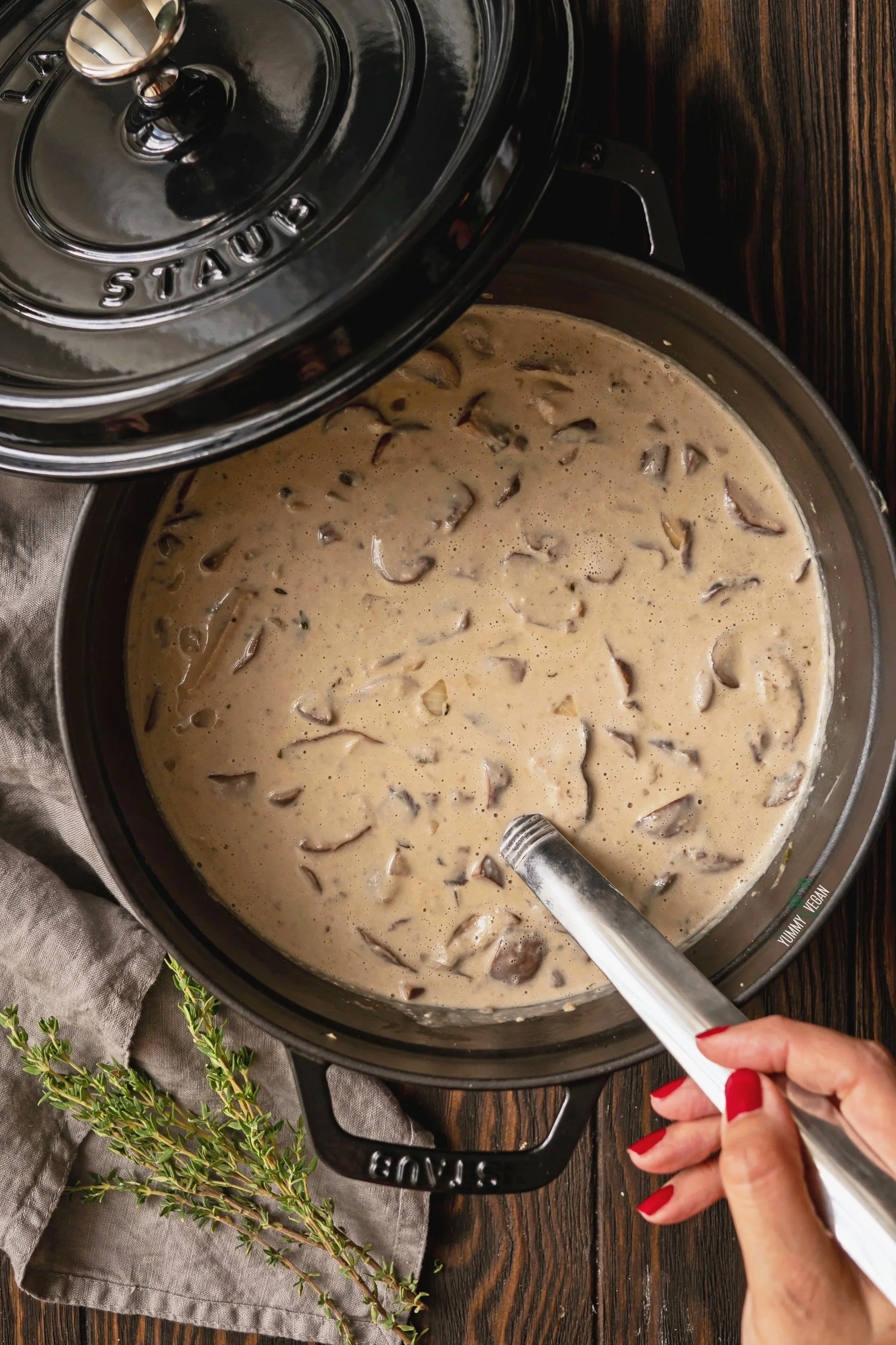 5. Pour in the cashew cream and mix through. Simmer on low heat for an additional 8-10 minutes. The soup should thicken a bit before serving. Check for seasoning and adjust with more salt & pepper if needed.