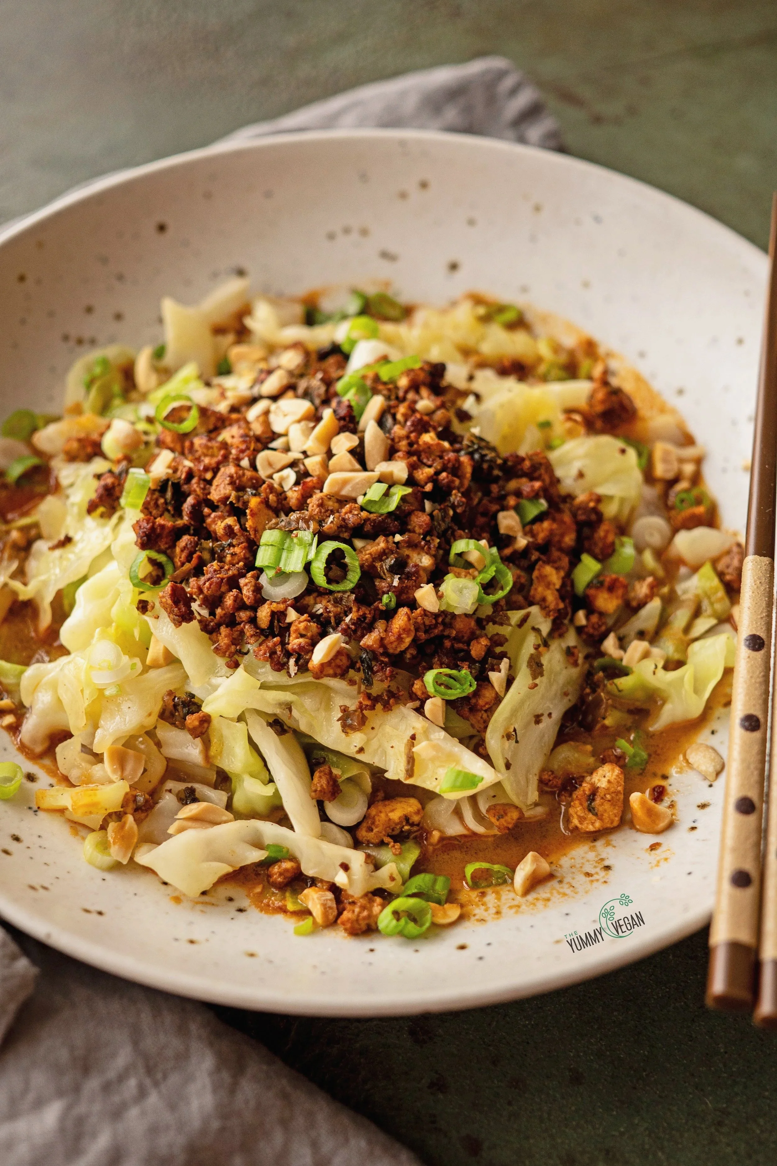 Dan Dan originates in the Sichuan province of China and is known for its complex and bold flavor profile. To be more exact, it’s the tingly numbing spice from the Sichuan peppercorns that gives it its signature flavor. In addition, the sauce is savory, slightly nutty and really good! Traditionally the dish is served with noodles but in this case the lightly sautéed cabbage pairs perfectly. It’s a lighter take on the original but with all of the same flavors. To keep the dish meat free the minced pork is swapped out for minced tofu. Together, this dish is super satisfying and perfectly spicy. I would say a medium spice level if prepared according to the directions. You can always adjust to your preferred heat level.