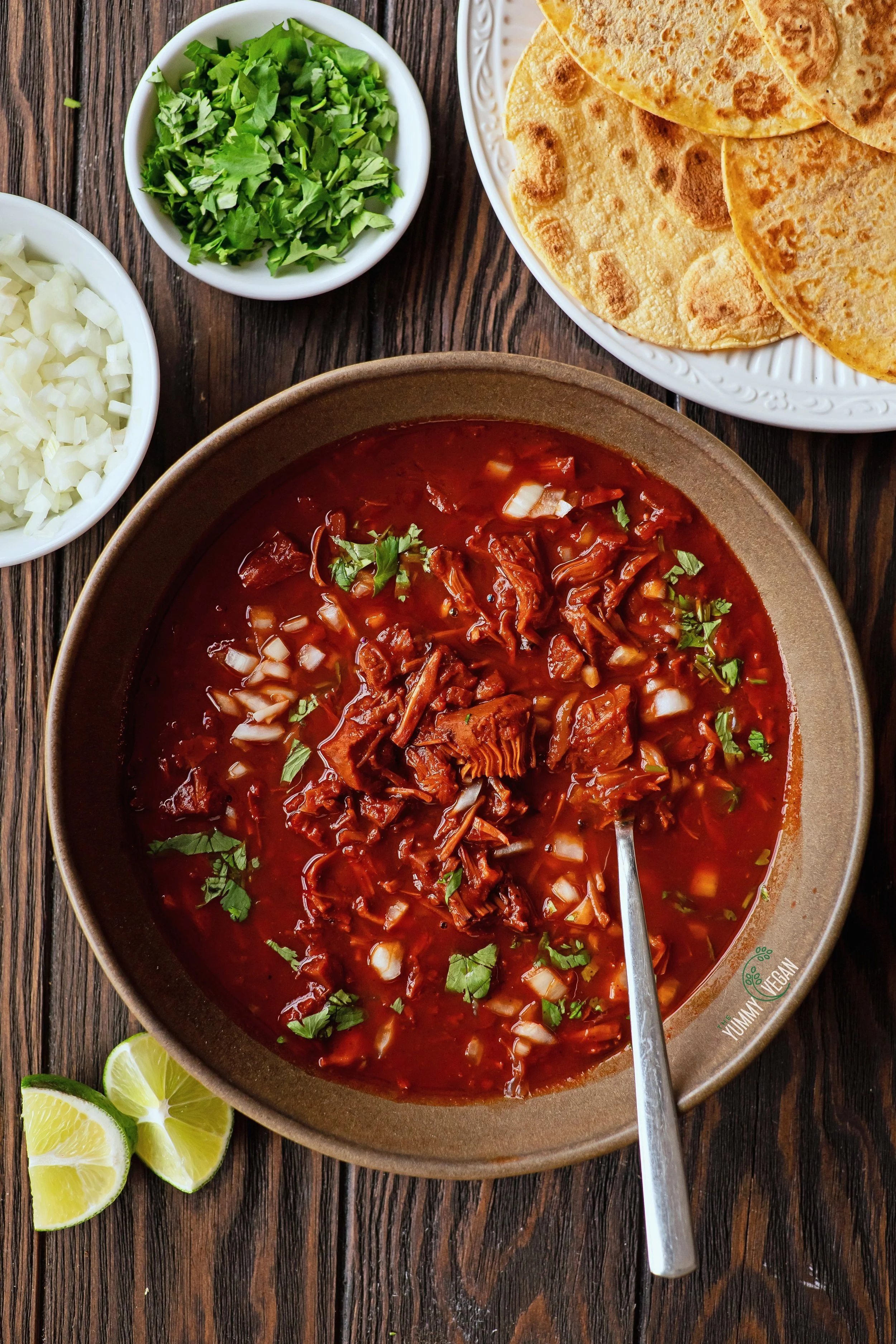 Birria is a rich and deeply flavorful meat stew that originates from Jalisco Mexico. This recipe uses jackfruit in place of traditional meat to give it texture while keeping it fully plant based / vegan. It’s made with a variety of dried chile peppers ranging from smoky to spicy along with plenty of spices that gives the birria its bold and complex flavor which makes for a very delicious stew. A popular way to enjoy birria is to fill tacos with the birria “meat” and serve them with a side of the broth known as consomé de birria. A more recent trend made popular on instagram is the quesabirria or tacos with cheese which is also served with consomé for dipping. Whichever way you choose to eat birria it should be served with fresh lime, diced white onions and chopped cilantro.