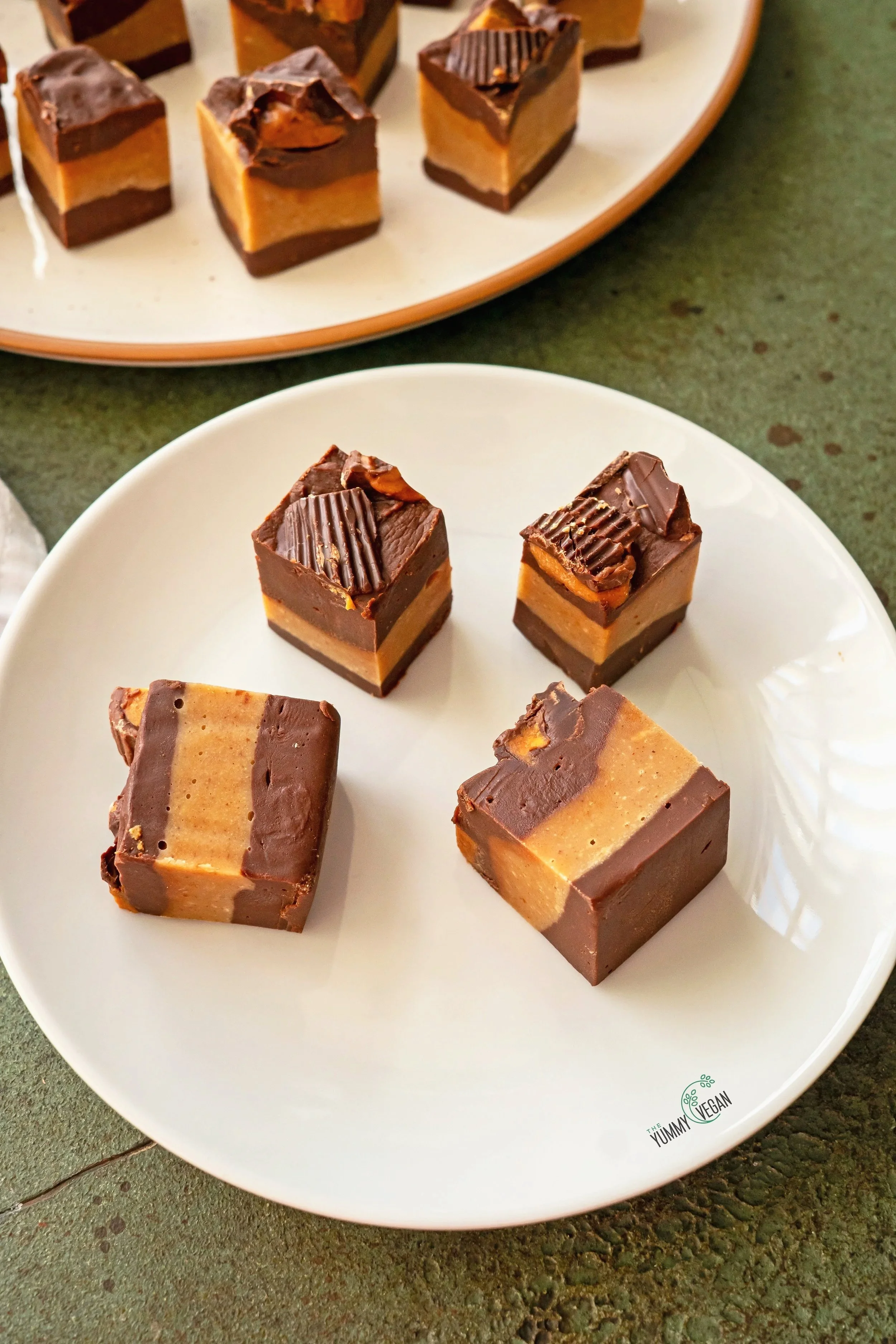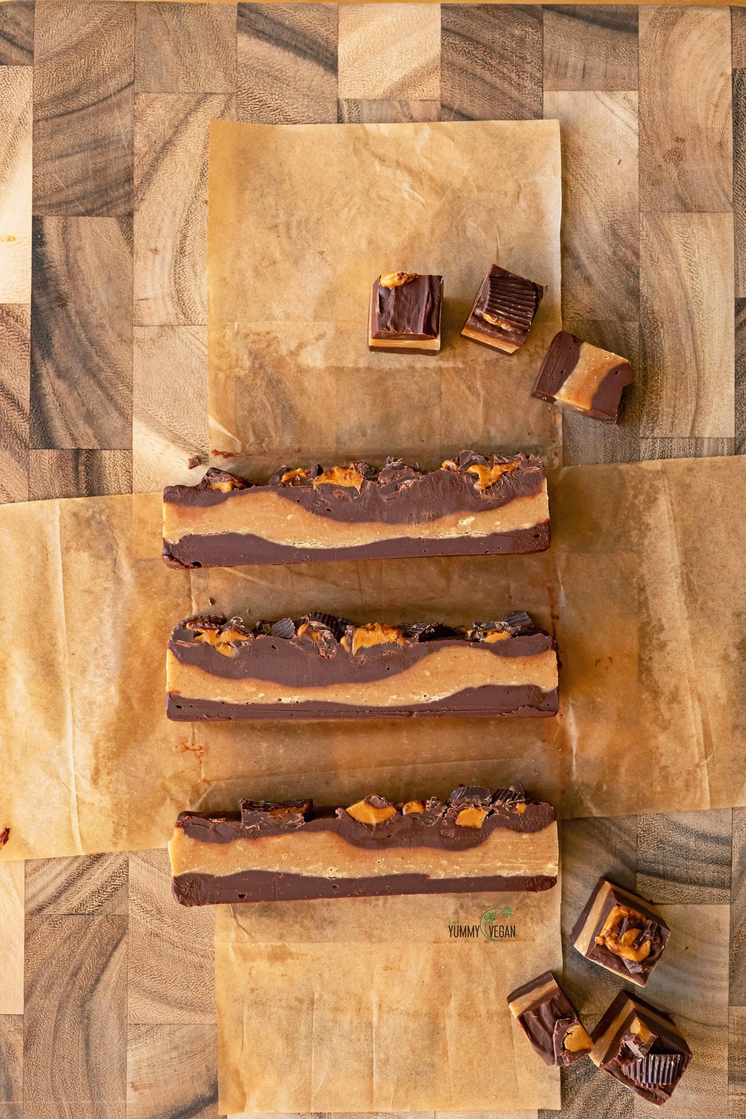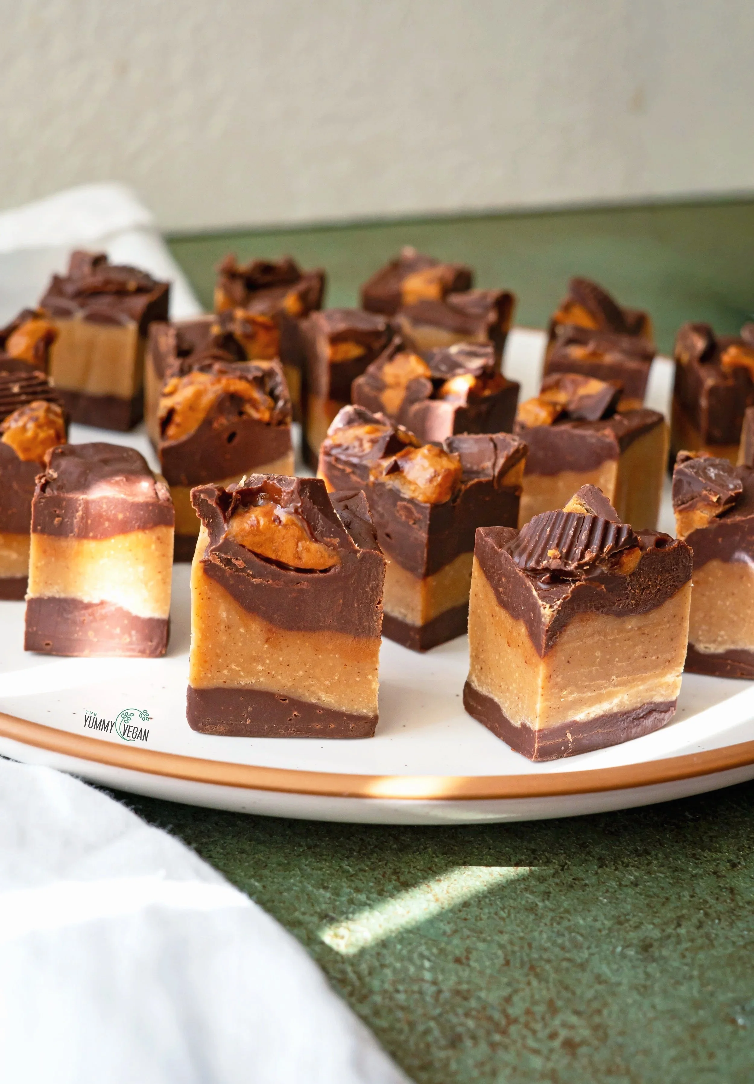 This rich, creamy no bake treat combines the classic pairing of chocolate and peanut butter. Layers of velvety chocolate and smooth peanut butter fudge create a stunning cross-section in every bite. Topped with a generous sprinkling of chopped mini peanut butter cups for a decadent finish. Perfect as a snack, dessert, or a sweet treat to share, if you can bear to!
