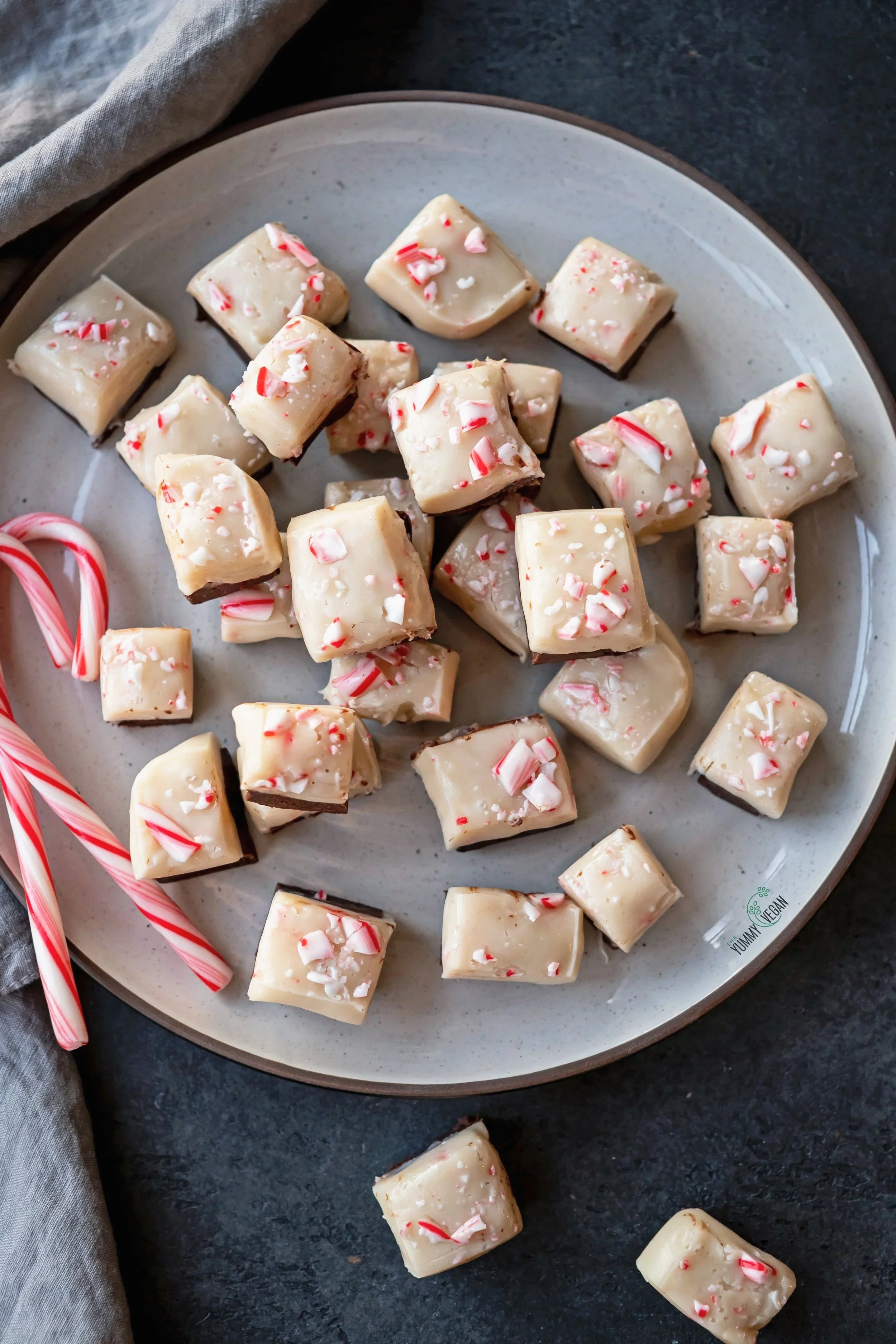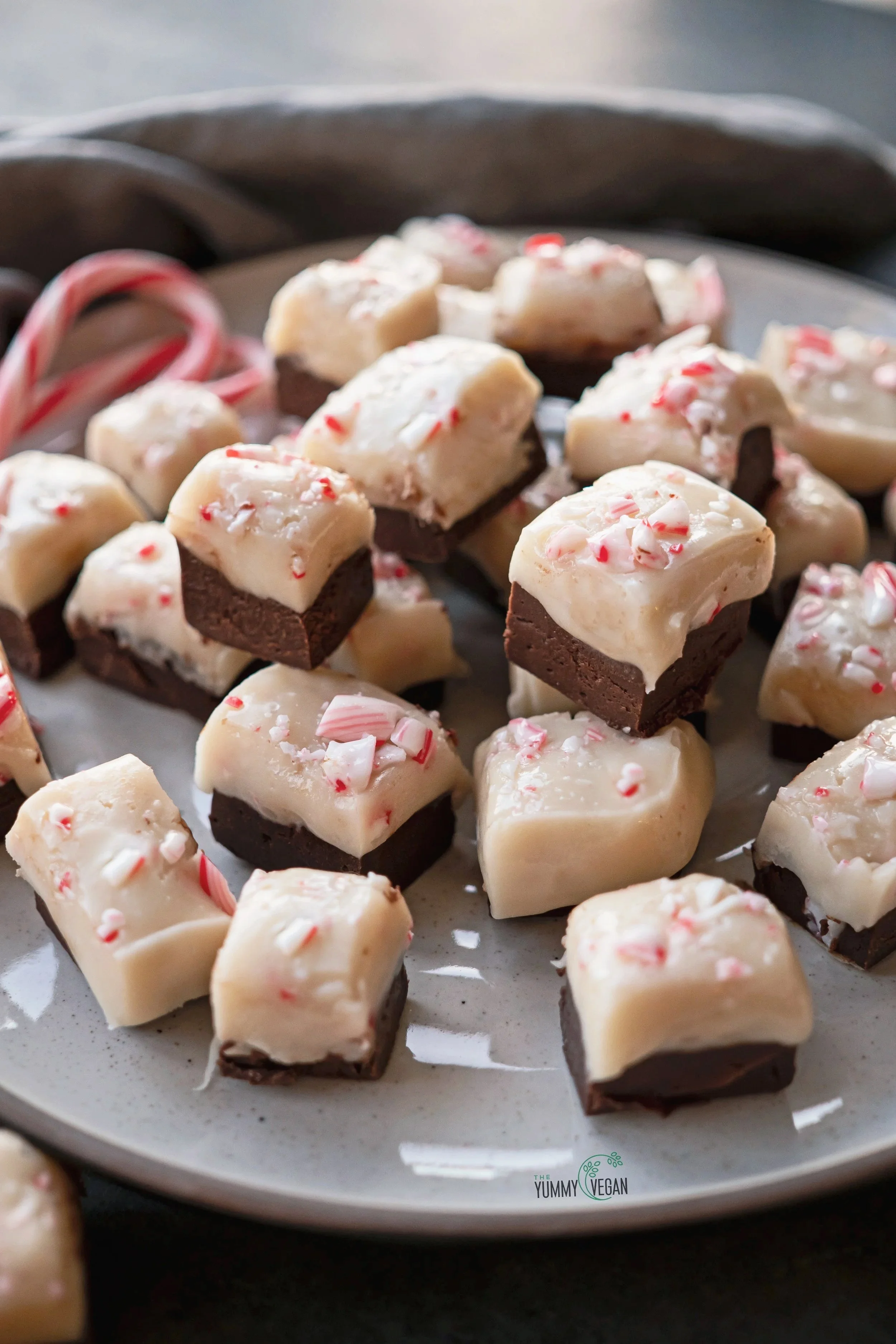 This addictingly delicious fudge combines rich, smooth chocolate with a cool peppermint flavor and a fun crunch from crushed candy canes. These festive little treats are perfect for holiday snacking or homemade gifting. They’re easy to make, dairy-free, and vegan. Each piece has distinct layers of dark and white chocolate that make them beautiful and visually appealing!