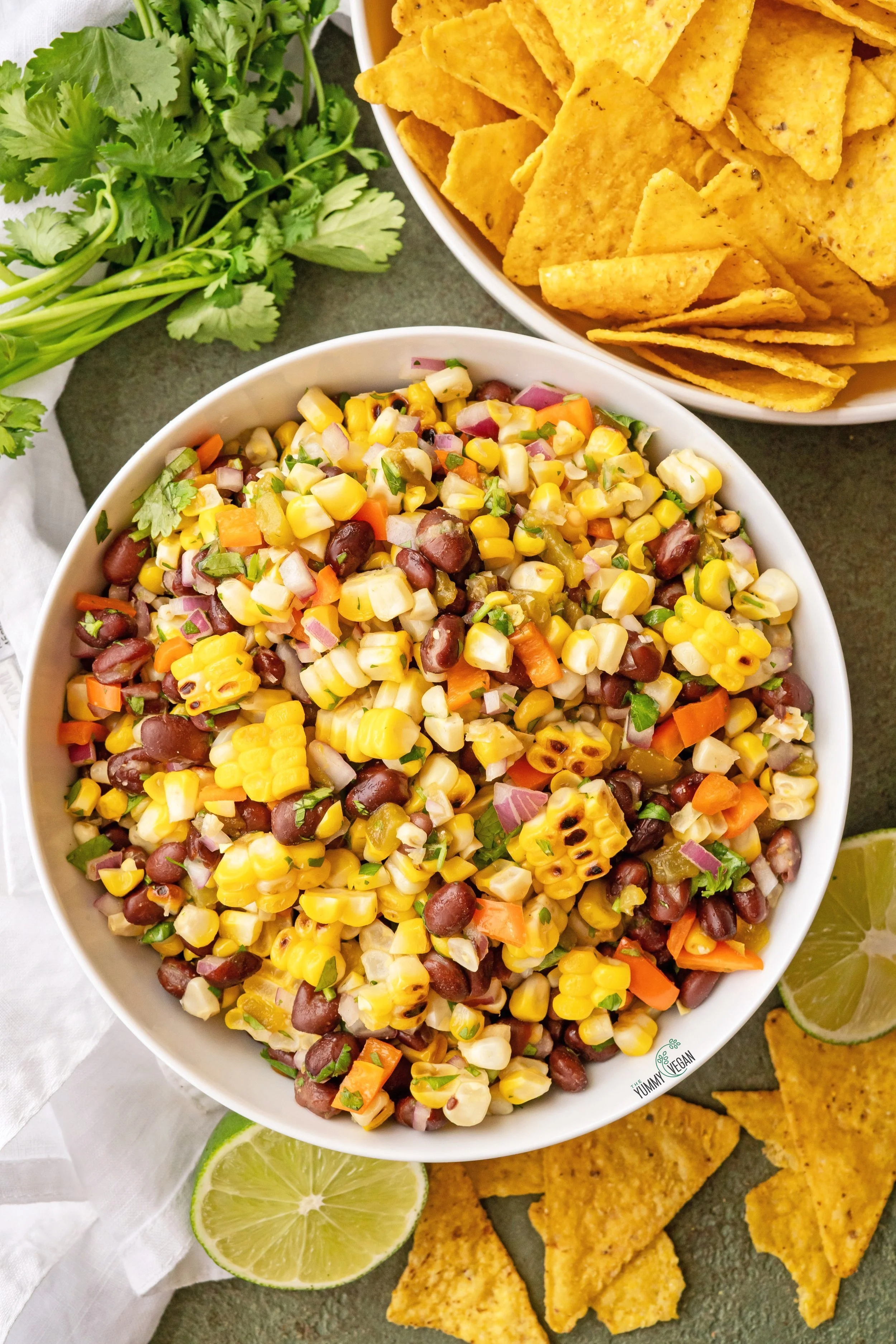 This has to be one of my favorite salsas to make. It’s full of amazing flavors and a blend of textures created by the crunchy red onion, soft black beans and juicy corn kernels. It’s super easy to make with just a bit of chopping. The corn can be charred on a grill, in a pan or you can even thaw out some frozen fire roasted. They all work great! Eat with tortilla chips as a snack or try adding it to any meal.
