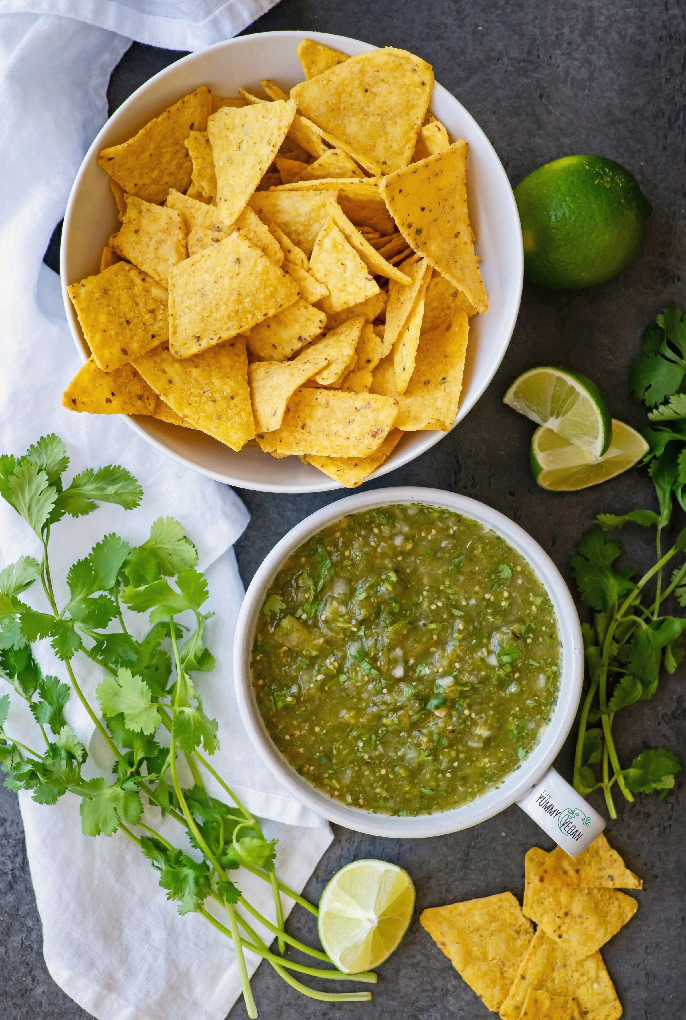 This gorgeous green salsa is made with tomatillos which are related to tomatoes as part of the night shade family (but closer to a goose berry or ground cherry). They grow with a papery husk around them that is removed prior to roasting. The salsa is bright, tangy and can be made as spicy as you like. It’s simple to make with minimal fresh ingredients and just a bit of roasting and blending. Enjoy it with tortilla chips but also on anything you would top with salsa.