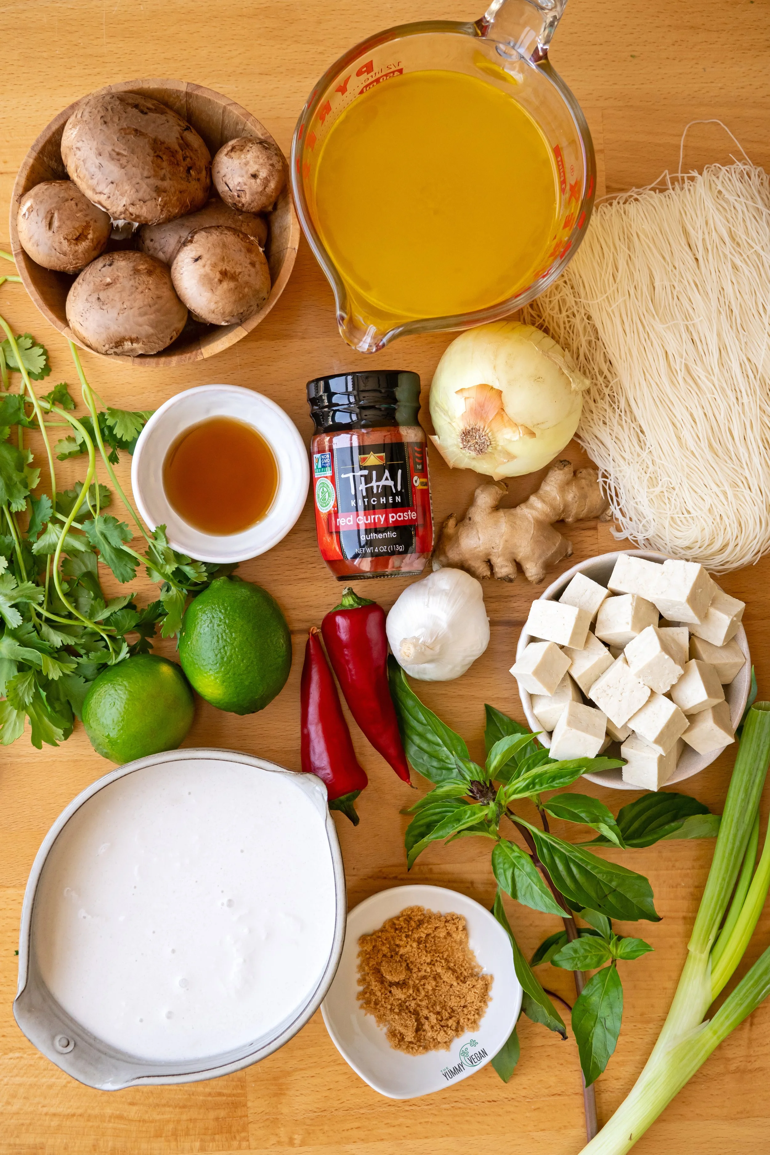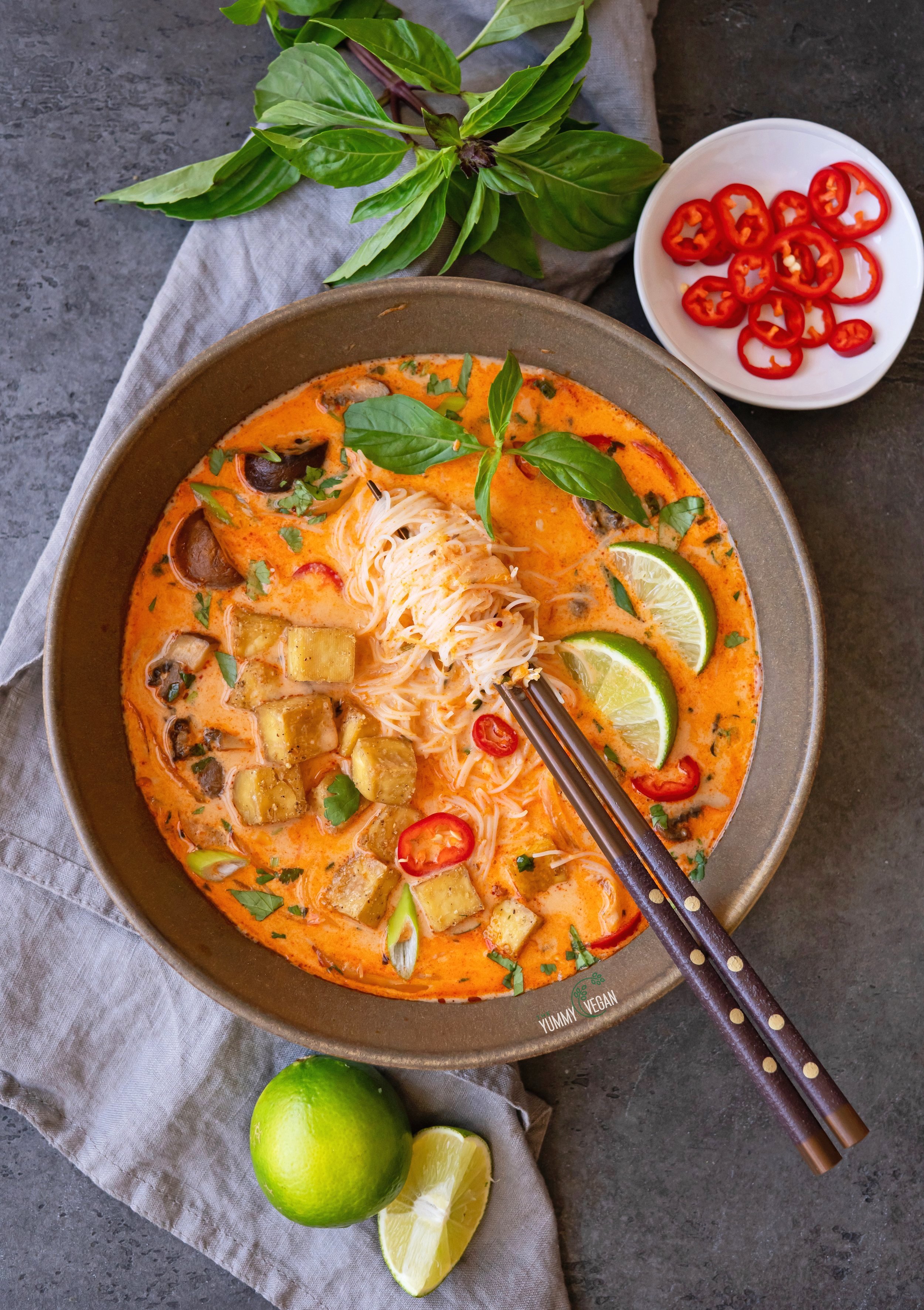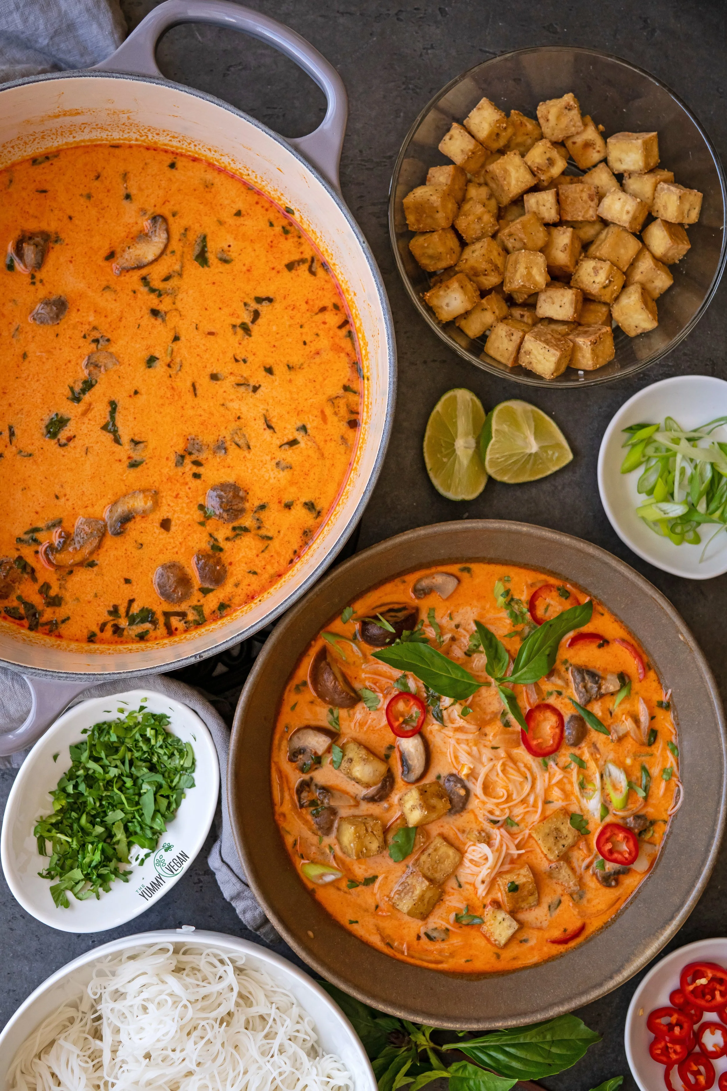 This utterly delicious soup is filled with amazing layers of flavors and textures! The broth is perfectly balanced with a mix of creamy, spicy (if you like), tart, herby and umami. The baked tofu, mushrooms and noodles provide a variety of textures. It can be made according to this recipe or with added vegetables like baby bok choy, green beans, bell pepper or carrots. It’s so good, that if you hadn’t made it yourself, it would leave you questioning whether it was homemade or take out!