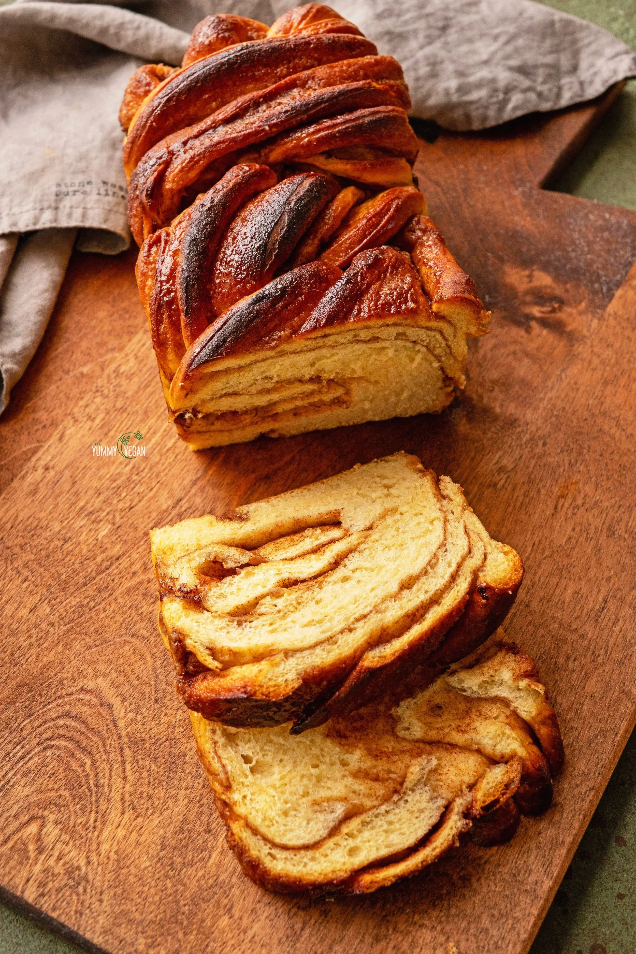 9.Place the rolled dough log vertically in front of you and using a sharp knife cut the log in half lengthwise. Turn the dough upwards to expose the layers and pinch the tops of each cut piece together. Take the two halves and gently braid them by crossing one over the other. Pinch the ends together.