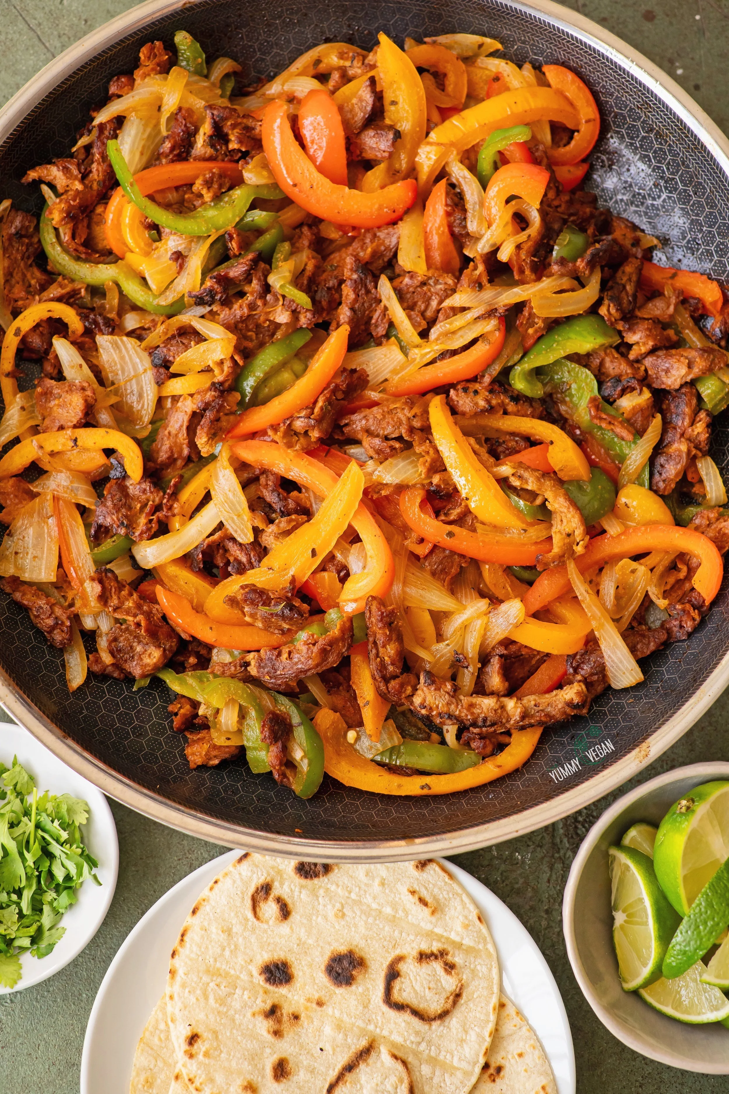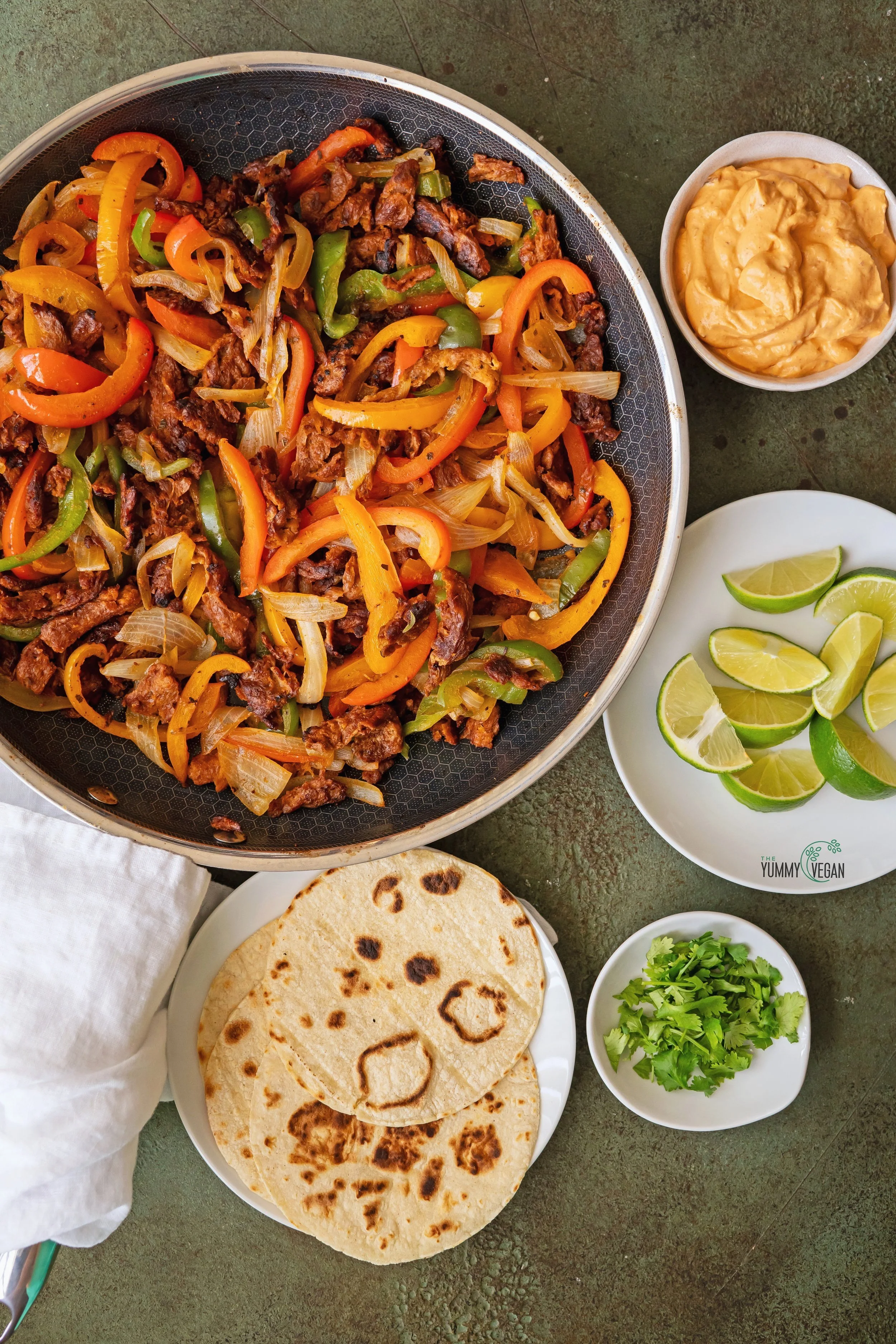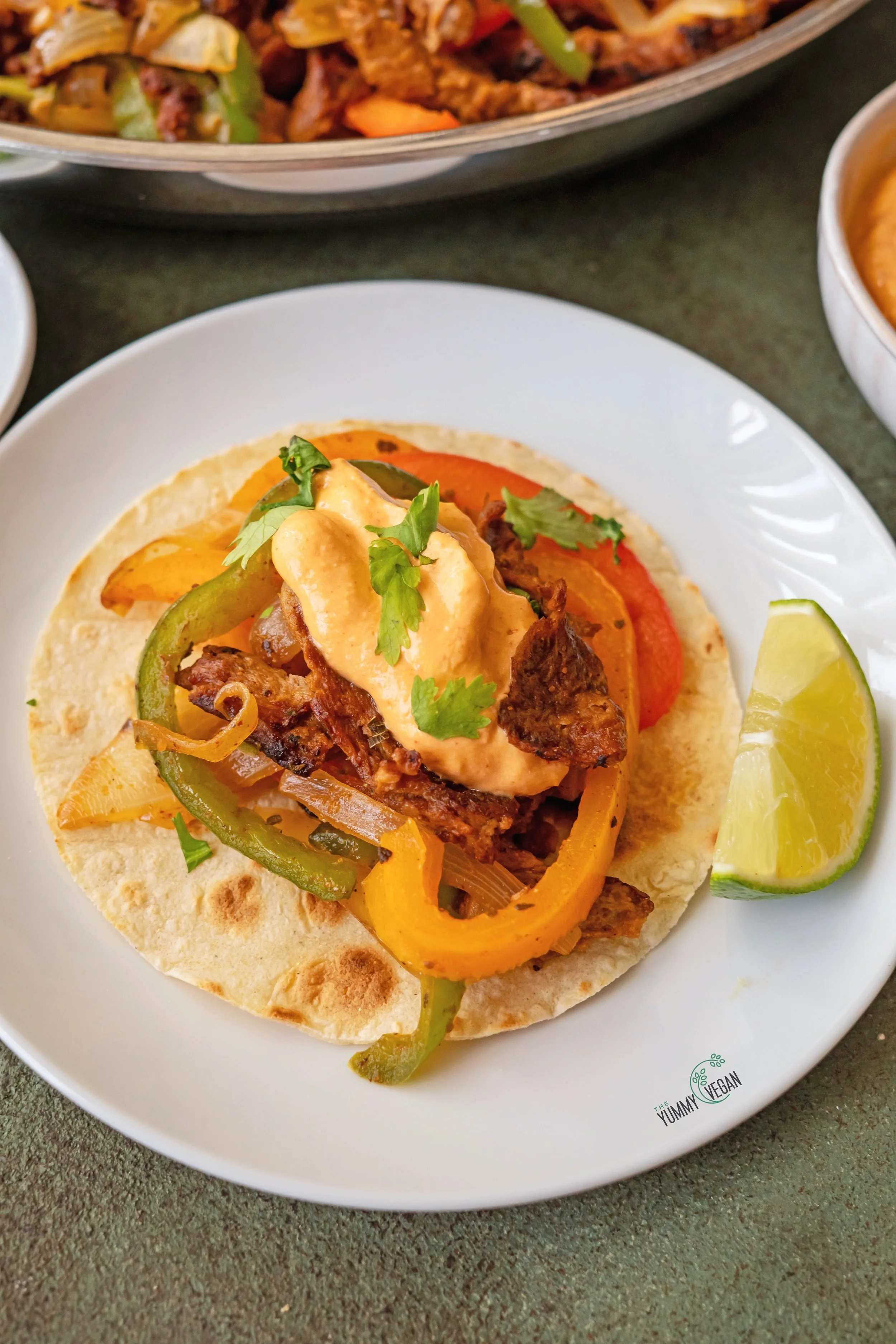 These delicious and flavorful steak fajitas are served in warm tortillas with a smoky chipotle cream. The steak is made with soy curls that have been rehydrated in a vegan beef broth.